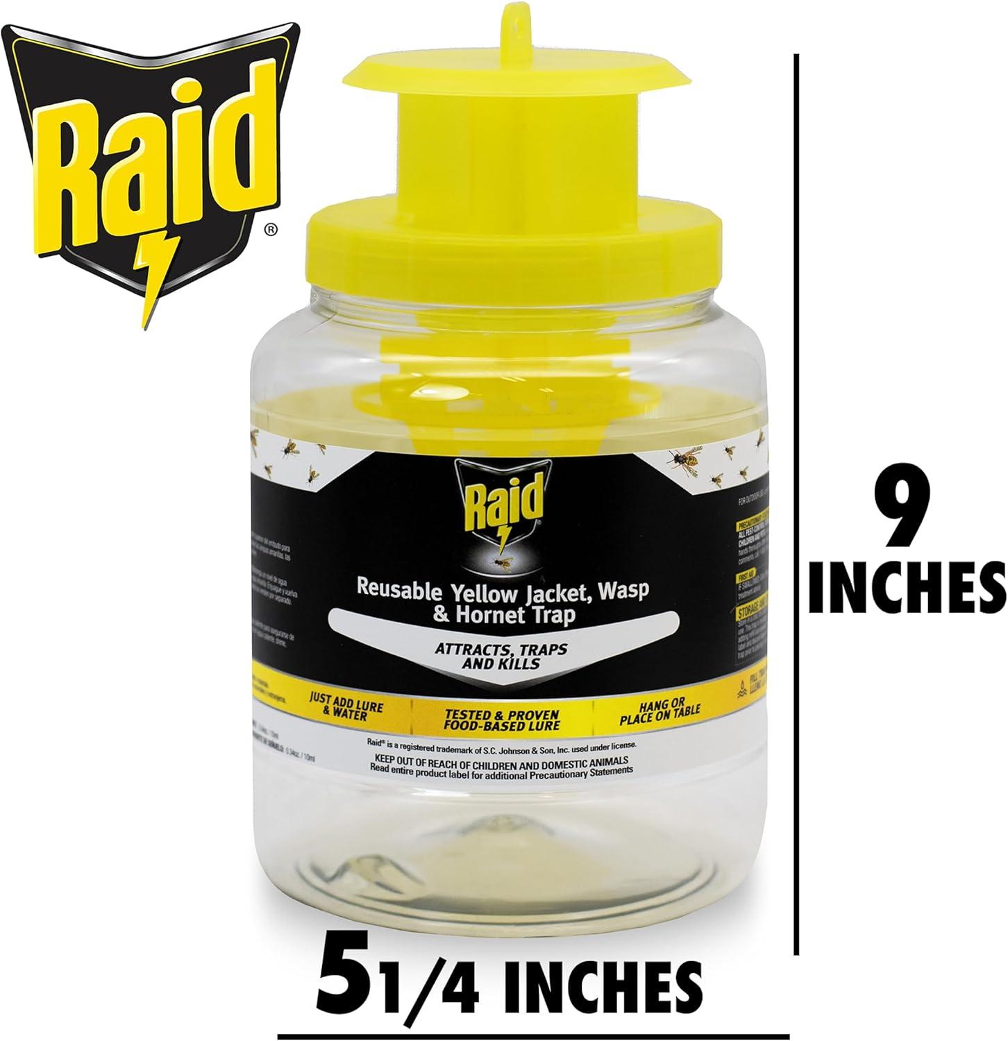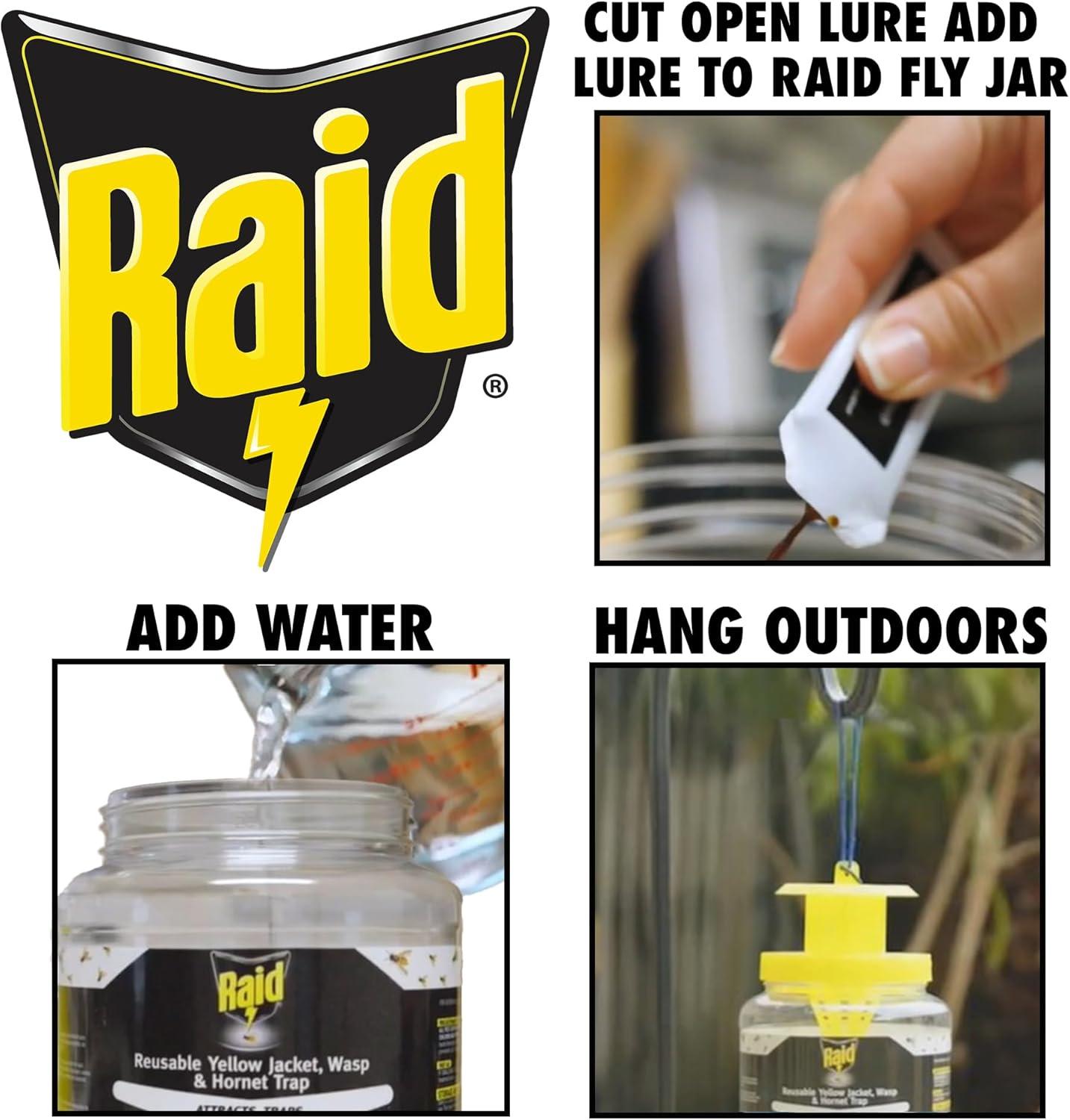 The Raid Reusable Yellow Jacket, Wasp, and Hornet Trap are equipped with a tested and proven food-based lure that attracts once water is added. The Custom designed entry entices flies to enter the trap. Once they enter, hey are unable to escape, and then drown. The trap is a sanitary, easy-to-use solution that works week after week. To use simply remove the seal around the yellow lid. Unscrew the yellow lid and set it aside. Remove the lure packet from inside the trap. Cut the tip of the lure packet and pour it into the bottom of the trap. Pour 2 1/2 cups of water into the trap and replace the yellow lid. Place the trap on a flat surface or attach a string to the top of the funnel to hang the trap. Ensure that the trap is used in an outdoor area where yellow jackets, wasps, and hornets are a nuisance away from outdoor living spaces.